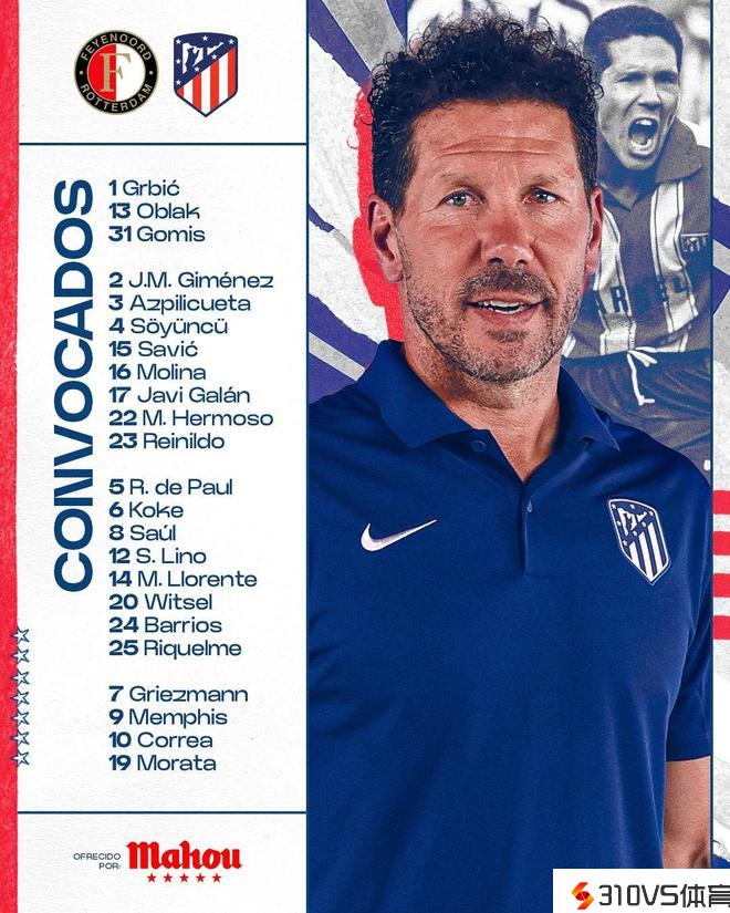马竞发布欧冠客战费耶诺德大名单:格列兹曼领衔,莫拉塔在列