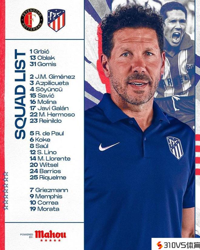 马竞欧冠大名单:格列兹曼、德佩、莫拉塔领衔