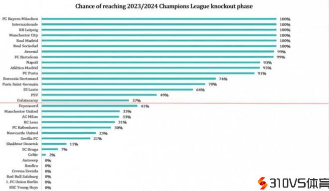 机构预测欧冠出线概率:阿森纳和巴萨90%+,曼联33%
