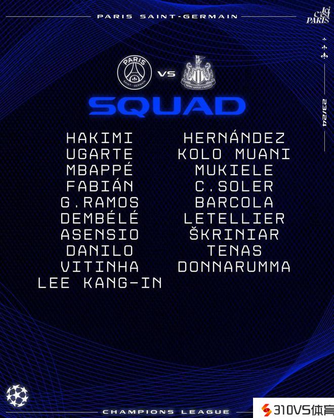 巴黎欧冠战纽卡大名单:姆巴佩领衔,后防线仅4人