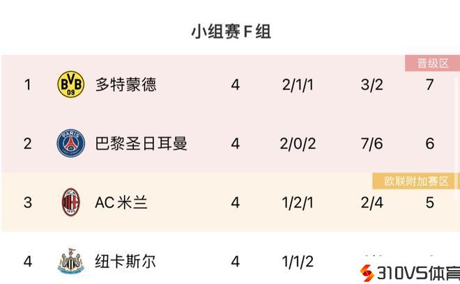 欧冠F组第五轮几小时后就将打响,第四轮事先多特7分第一,巴黎6分第二,米兰5分第三,纽卡4分垫底。本轮米兰将战多特,巴黎战纽卡。赛前先来看看四队的出线情势。