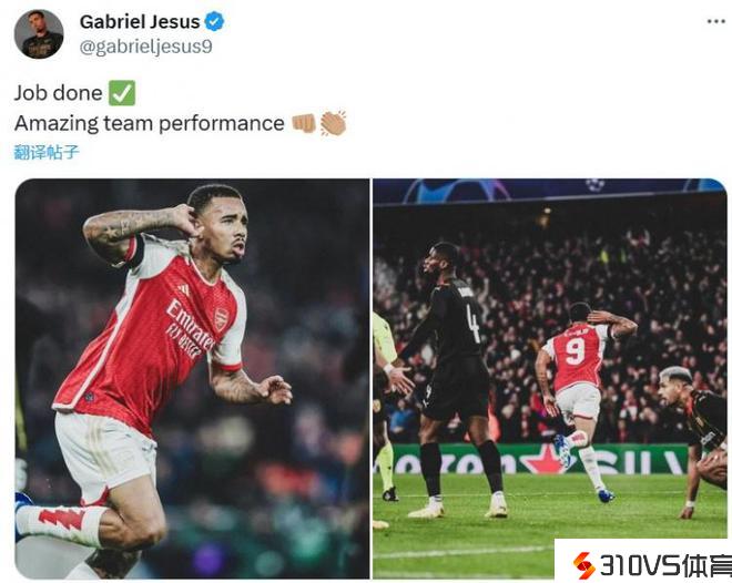 延续4场欧冠破门,热苏斯社媒晒照:晋级义务完成,全队表现出色