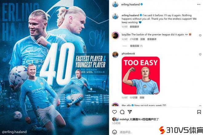 成为欧冠40球用时场次最少&最年轻球员,哈兰德社媒晒海报纪念