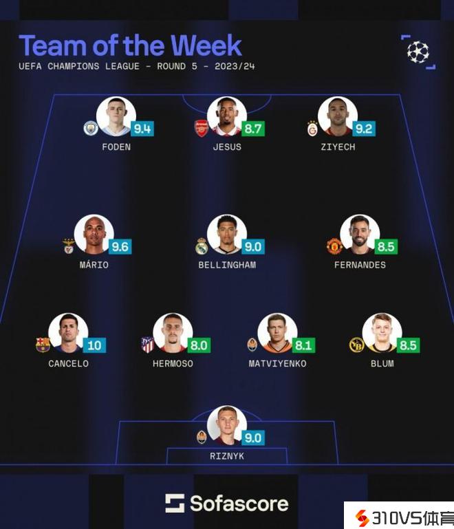 sofascore评本轮欧冠最佳阵:贝林厄姆领衔,热苏斯&B费在列