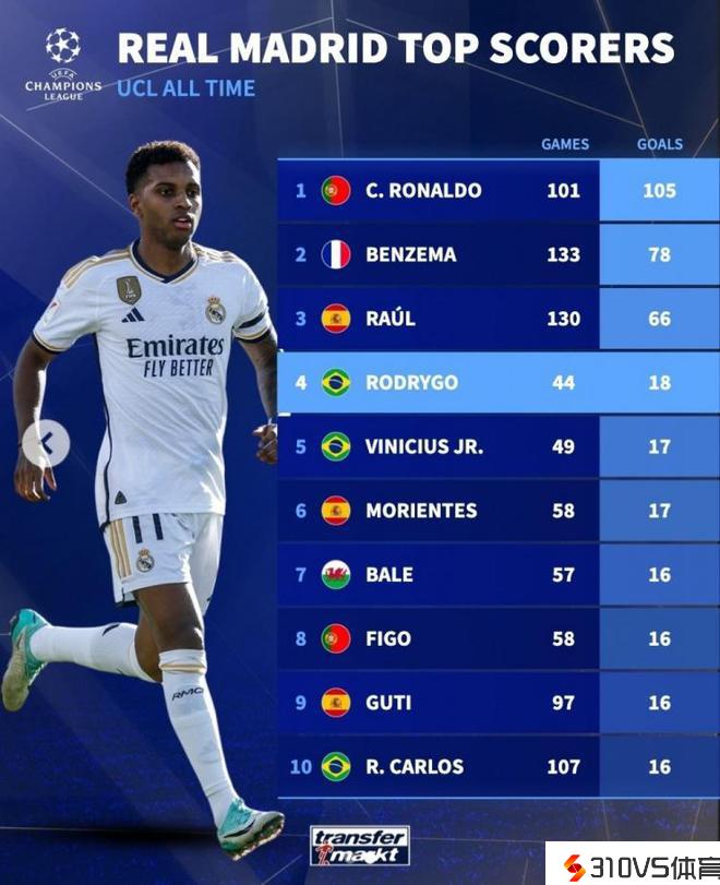 皇马队史欧冠进球榜:C罗101场105球居首,罗德里戈18球第四