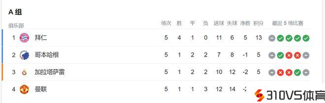 上轮赛果:加拉塔萨雷3-3曼联;拜仁慕尼黑0-0哥本哈根