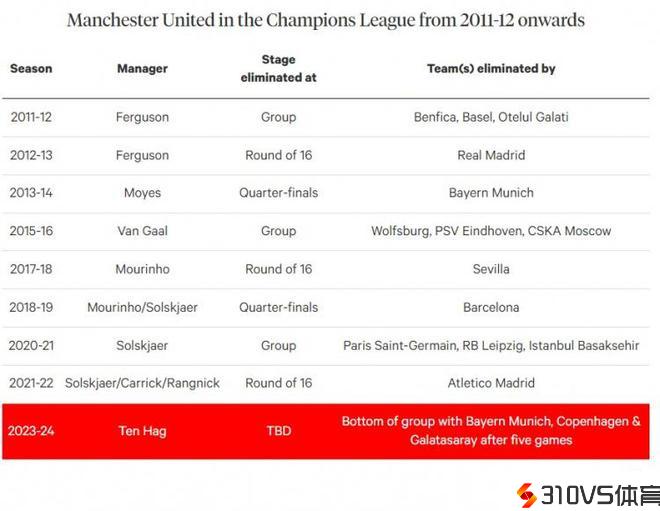 曼联近8次参与欧冠3次小组出局,最好效果2次进入8强