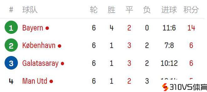 欧冠A组实时积分榜:曼联仍5分垫底,哥本哈根、加拉塔萨雷各6分