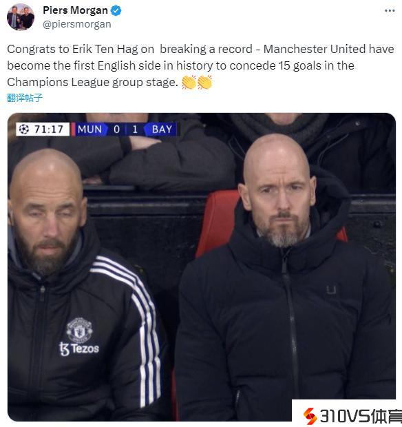 曼联欧冠小组赛丢15球创为难纪录摩根:祝贺滕哈赫破纪录