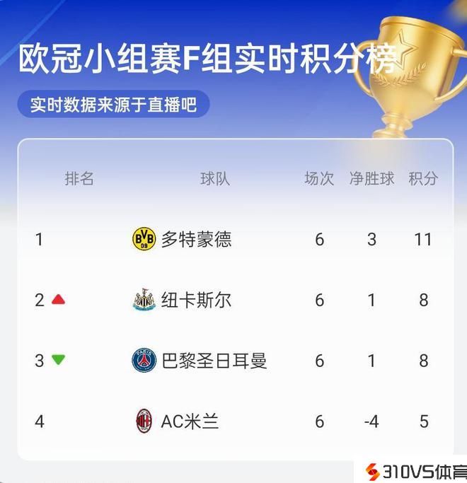 死亡之组实时积分榜:纽卡升至第二,巴黎降至第三,米兰仍垫底