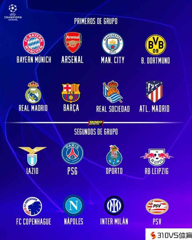 种子队:拜仁、阿森纳、皇马、皇家社会、马竞、多特、曼城、巴萨