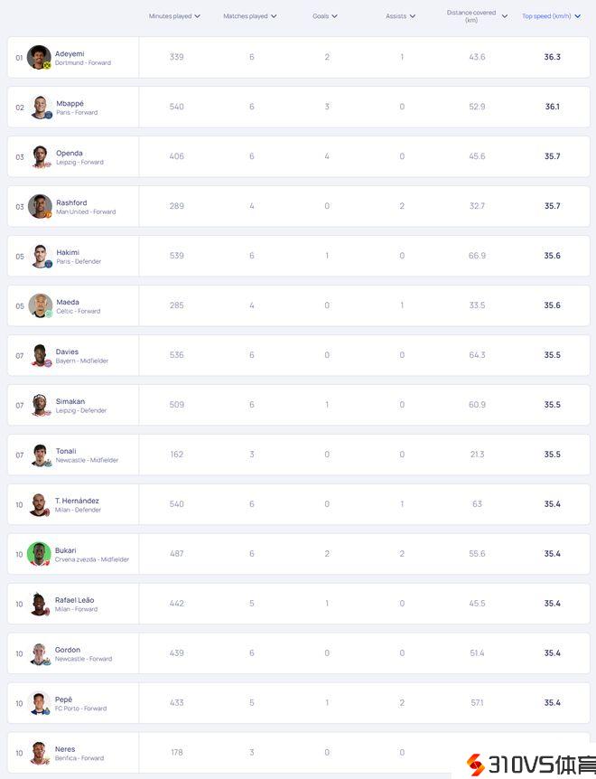 欧冠小组赛落下帷幕,欧足联官网更新了小组赛球员最高时速排行榜!阿德耶米排名第1,姆巴佩第2,拉什福德第3。日本前锋前田大然排名第5,托纳利排名第7,令人稍感不测。