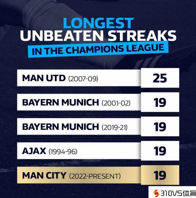 欧冠延续不败场次榜:曼联25场居首,曼城、拜仁19场并列第二