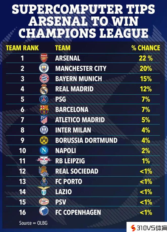 我厂下降超算预测欧冠冠军:阿森纳22%领跑,曼城第2拜仁第3