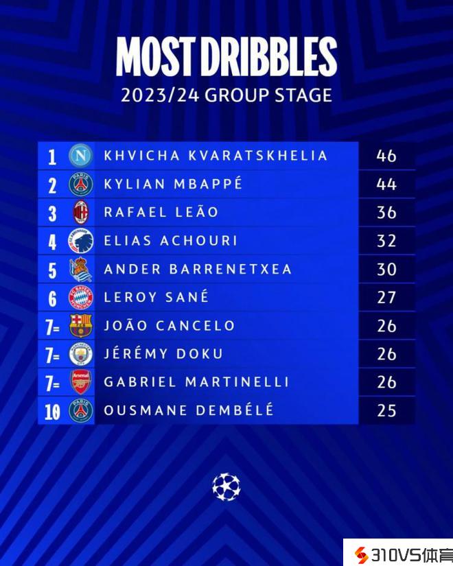 欧冠小组赛过人榜:K77居首,姆巴佩第二莱奥第三