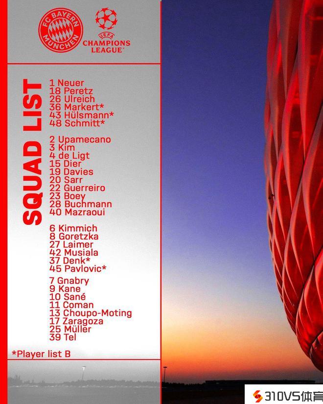 拜仁欧冠淘汰赛大名单:诺伊尔、凯恩领衔,戴尔等新援在列