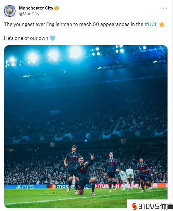曼城官推称赞福登:达成欧冠50场成就最年轻的英国球员