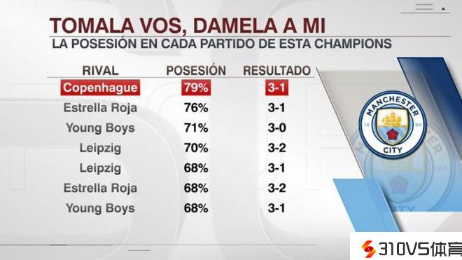 曼城对阵哥本哈根控球率79%,本赛季至今7场欧冠竞赛最高
