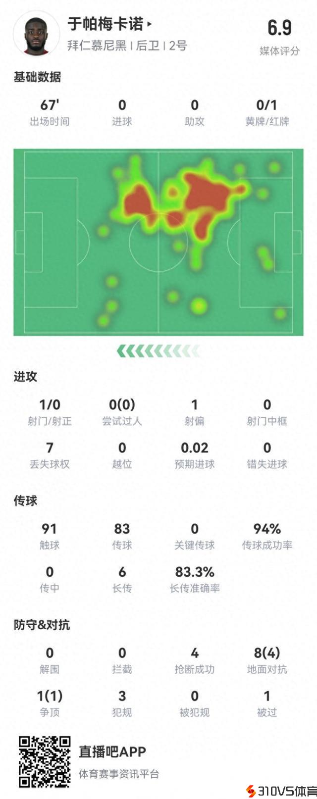 于帕本场数据:1次送点,4次抢断,5次成功长传,获评6.9分