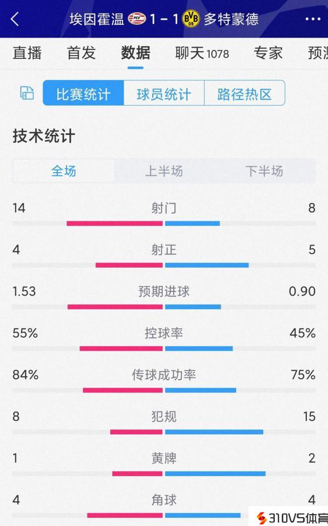 埃因霍温1-1多特全场数据:射门14-8,射正4-5,多特控球率45%