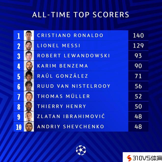 欧冠历史射手榜,C罗140球居首,梅西129球第二,莱万93球第三
