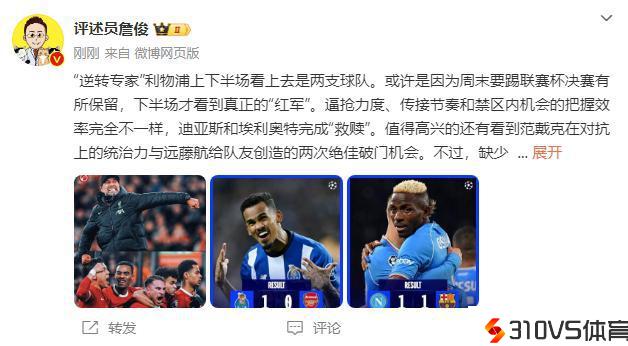 利物浦在联赛4-1逆转卢顿,阿森纳在欧冠0-1遭波尔图绝杀,巴萨欧冠1-1那不勒斯。赛后詹俊发文点评。
