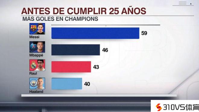 球员U25时期欧冠进球榜:梅西59球居首,姆巴佩46球次席