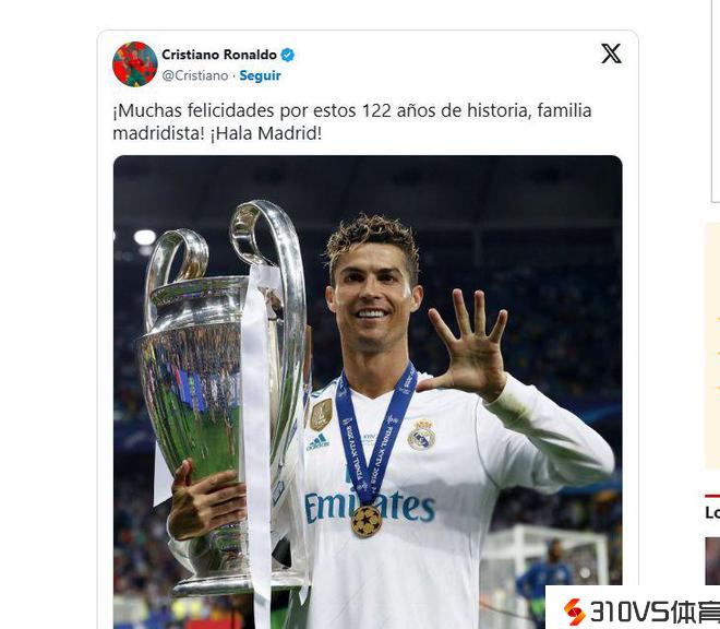 克里斯蒂亚诺·罗纳尔多对皇家马德里俱乐部的122周年庆贺表示祝贺。这位葡萄牙球星在Instagram和X(之前是Twitter)上发布了一张他自己与最后一次赢得的欧冠奖杯的照片,并附上了一条音讯:“祝贺这个拥有122年历史的马德里家族!哈拉马德里!”他在这条音讯中回想起了他在皇马效能了九个赛季。