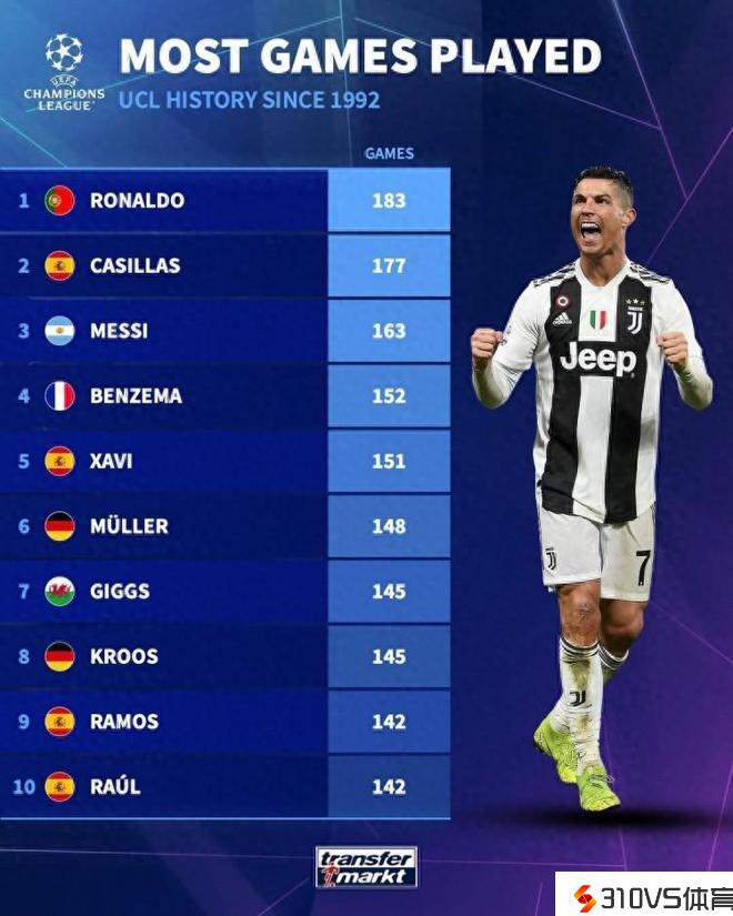 欧冠出场次数排行榜:C罗183次第一,卡西177第二,梅西163第三
