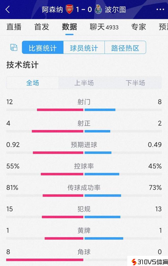 阿森纳vs波尔图90分钟数据对比:射门12-8,射正4-2,角球8-0