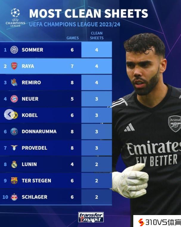 本赛季欧冠零封次数榜:索默6场4零封居首,拉亚7场4零封第二