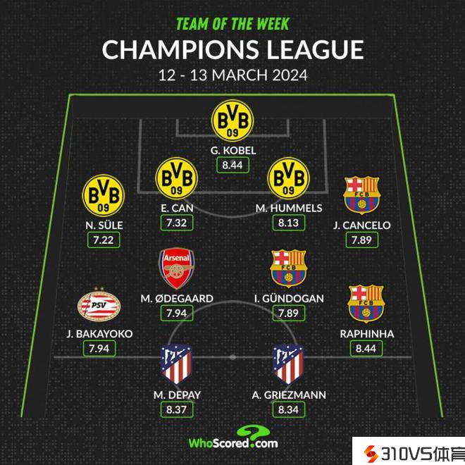 WhoScored欧冠本周最佳阵:厄德高、格子在列,多特4人巴萨3人