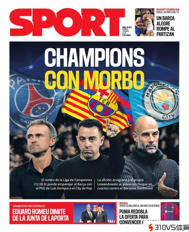 每体头版:巴萨欧冠能够与恩里克或瓜迪奥拉重逢 莱万想碰多特