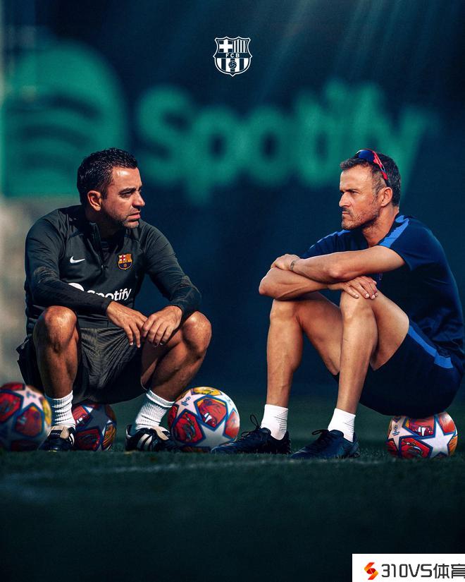 欧冠迎来师徒对决,巴萨官方晒哈维、恩里克坐球对视海报