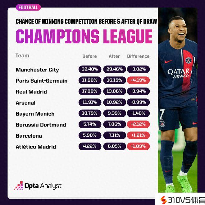 3月15日欧冠抽签结果出炉,上半区马竞vs多特、巴黎vs巴萨,下半区阿森纳vs拜仁、皇马vs曼城。抽签的构成和确认的决赛路途对Opta超级计算机的预测发生了相当大的影响。曼城在抽签后夺冠的能够性下降了3.02%,皇马则下跌了3.94%。依据超级计算机的数据,巴黎曾经取代皇马成为对曼城的最大要挟。因此,巴黎赢得第一个欧冠冠军的时机提高了4.19%,他们成为了抽签的最大赢家。
