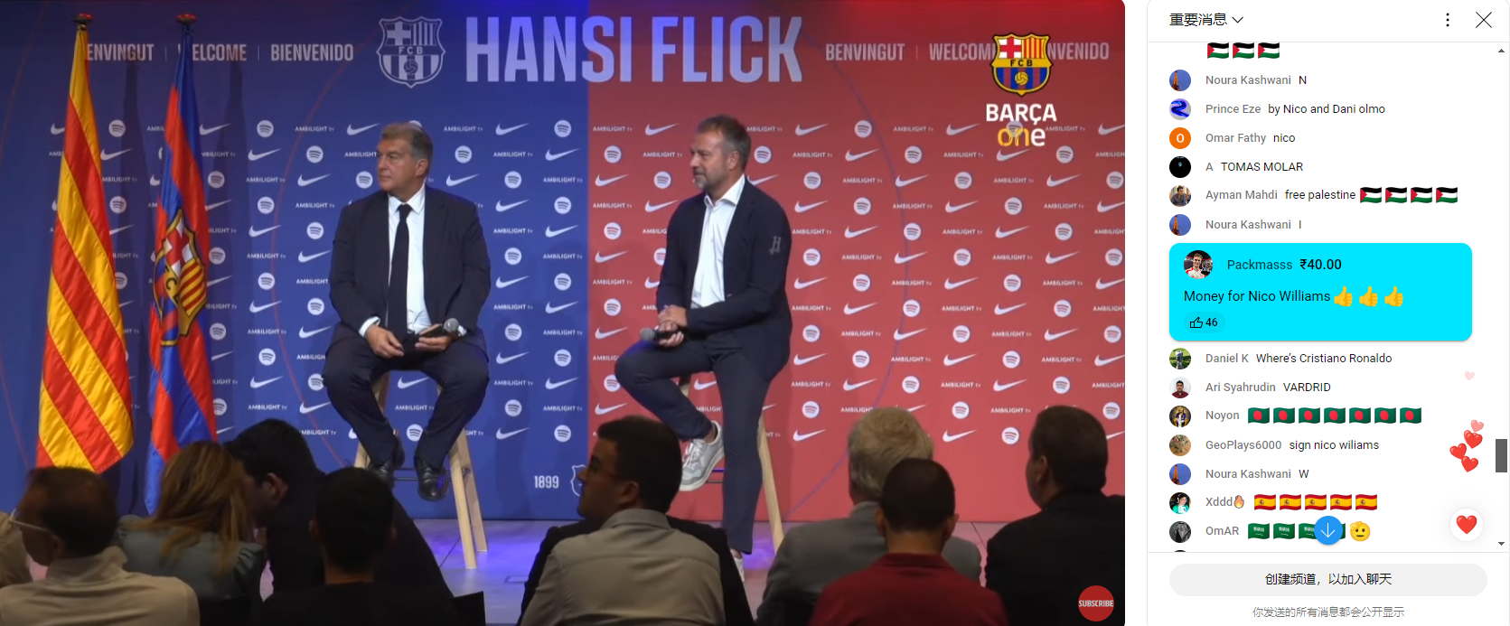 北京时间7月25日讯 今日,巴萨官方在美国行前为新任主教练弗里克举行正式的亮相仪式,仪式直播中,不少巴萨球迷在直播过程中不断送出捐款,并备注“这些是为了签下尼科的”。