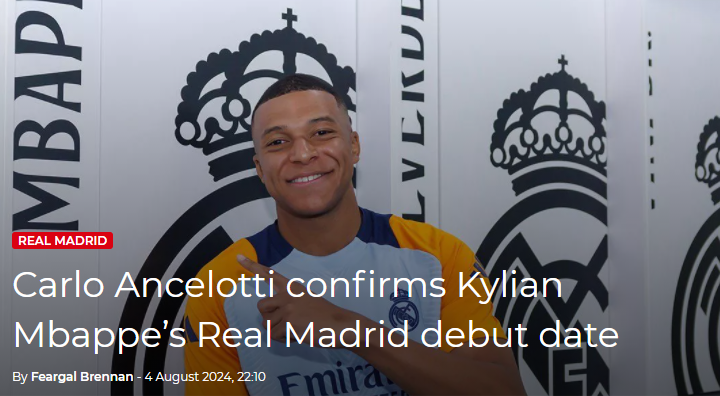 据西班牙媒体football-espana报道,皇马主帅安切洛蒂已确认,姆巴佩将于北京时间8月15日欧洲超级杯迎来首秀,对手是亚特兰大队。