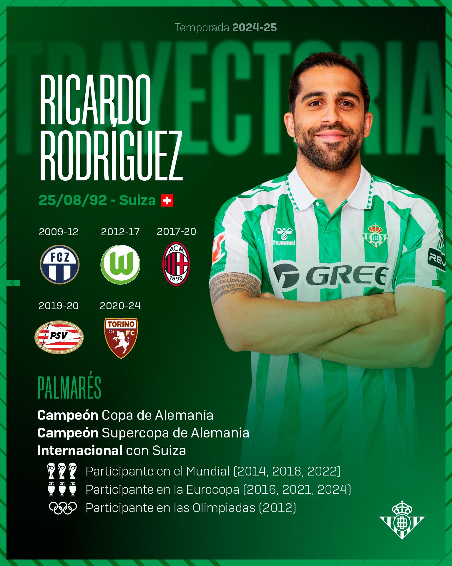 皇家贝蒂官宣了31岁瑞士左后卫里卡多-罗德里格斯面前加盟球队,球员已经通过体检,并将与球队签约至2026年。