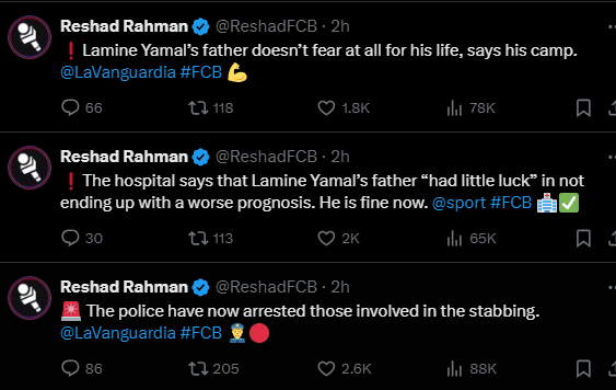433的巴萨跟队记者Reshad Rahman报道,西班牙新星亚马尔的父亲在停车场被不明人士刺伤,目前警方正在调查。