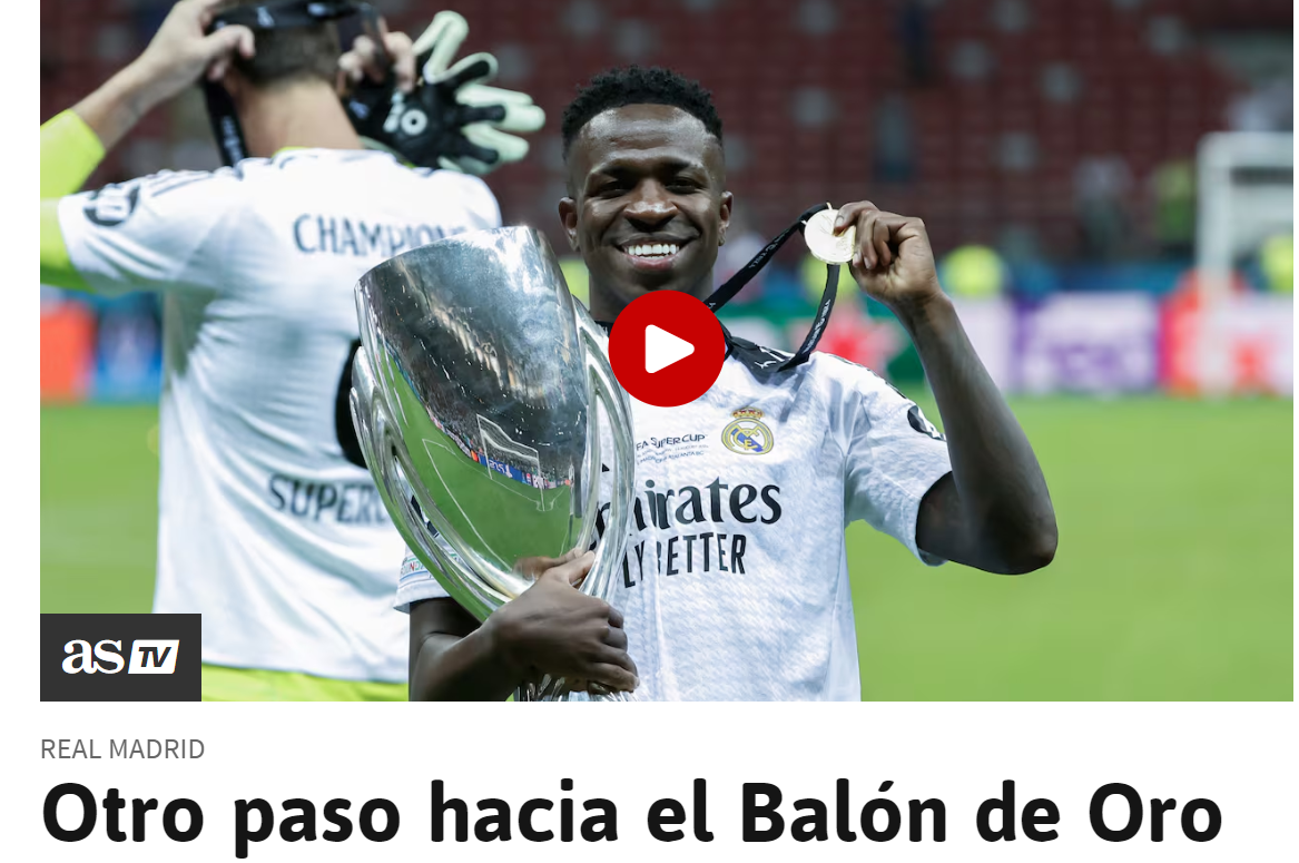 今晨的欧洲超级杯赛事里,姆巴佩破门,维尼修斯、贝林厄姆实现助攻。赛后《阿斯报》头版以“维尼修斯距金球奖更近”为题,赞美了巴西球星的出色表现。