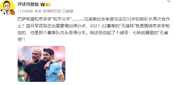 詹俊写道:“巴萨希望和京多安“和平分手”............瓜迪奥拉会考虑与这位33岁的前队长再次合作么?蓝月军团现在也需要增加得分点,2021-22赛季的“无锋阵”就是围绕京多安制定的,他是那个赛季队内头号得分手。我还给他起了个绰号:七种武器里的“孔雀翎”! ”