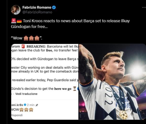 京多安加盟巴塞罗那仅一年,现在却可能离开,这让前德国国家队队友托尼·克罗斯感到惊讶。克罗斯在著名转会记者罗马诺的相关推文中做了简单的评论:“哇”,并配上了三个表情符号来表达自己的惊讶之情。