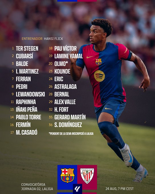 北京时间8月25日凌晨01:00,西甲第2轮,巴萨坐镇主场迎战毕尔巴鄂竞技。赛前巴萨公布大名单: