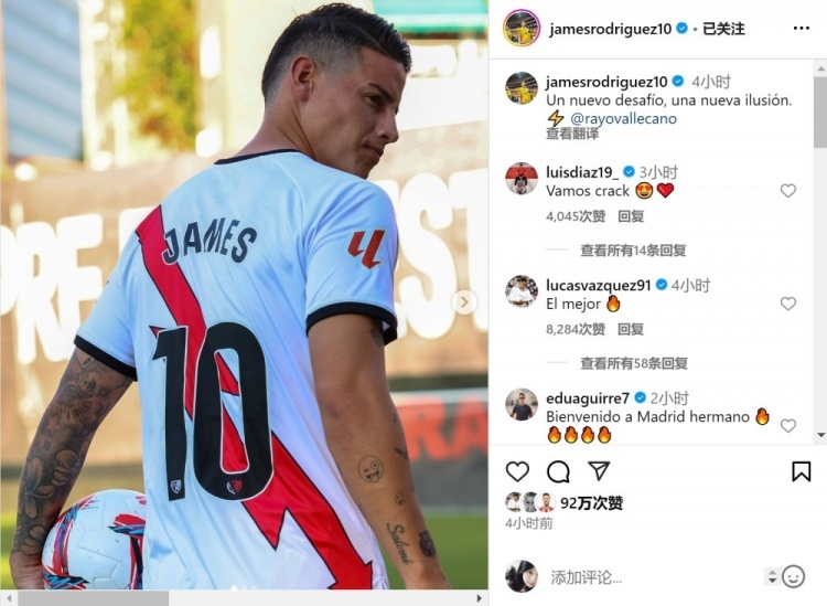 J罗社媒晒身披巴列卡诺10号球衣:新的挑战 新的梦想
