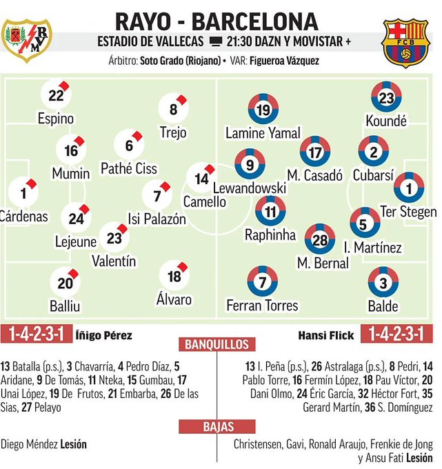 1-特尔施特根 3-巴尔德 5-伊尼戈·马丁内斯 2-库巴西 23-孔德 17-卡萨多 28-贝纳尔 9-莱万多夫斯基 11-拉菲尼亚 19-亚马尔 11-费兰·托雷斯