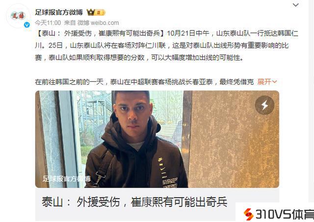 此前《体坛周报》泄漏崔康熙在抵达仁川前后找到了一些球员谈心,在多名主力球员受伤的状况下,胡靖航有望扮演奇兵角色。而足球报在上午11点,在社交也发布静态,直言外援受伤,崔康熙有能够出奇兵。
