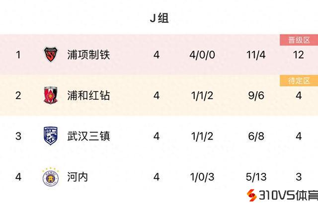 亚冠J组积分榜:武汉三镇4轮4分居小组第三,末两轮连战浦和浦项