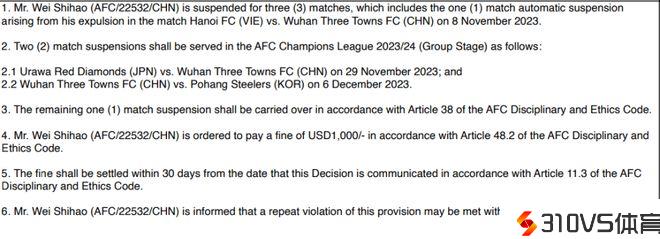 亚足联纪律委员会依据《亚足联纪律与品德准绳》第47条规则,认定该举措为可被直接罚令出场的严重犯规。因此,对韦世豪处以停赛3场的处分(含被红牌罚下自动停赛一场),并且处以1000美元的罚金。同时,亚足联方面责令球员需在30天内结清,并告知球员,如再次出现此类状况,能够会遭到更严峻的处分。