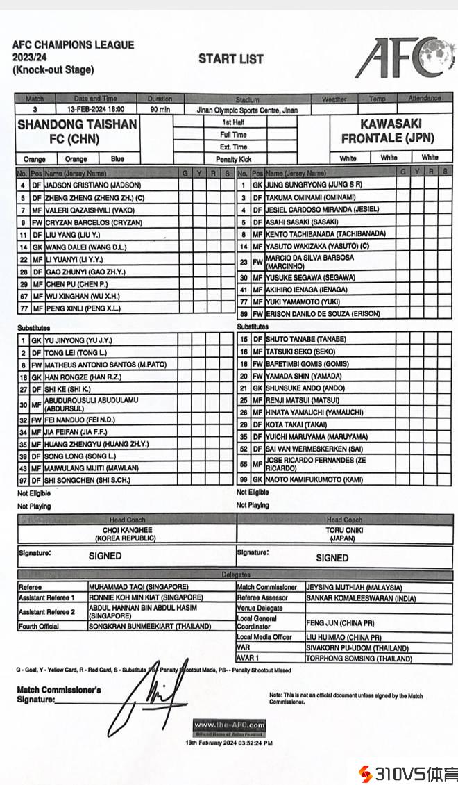 亚冠泰山队vs川崎前锋首收回炉:吴兴涵、高准翼先发,帕托替补