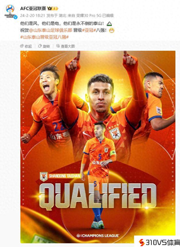 山东泰山晋级亚冠八强!亚冠联赛官博发文祝贺:他们是风,他们是电,他们是永不倒的泰山!